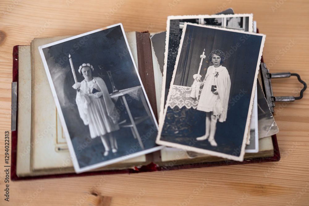 Vintage photo album with blank space, inviting viewers to preserve precious moments, vintage photos 50s, 40s, family tree, genealogy, memories, family connection generations
