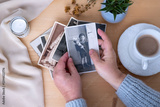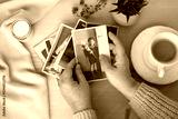 vintage Nostalgic photo album with blank space for picture on wooden table, surrounded by memories and keepsakes, concept genealogy, memory ancestors, family ties, sentimental atmosphere