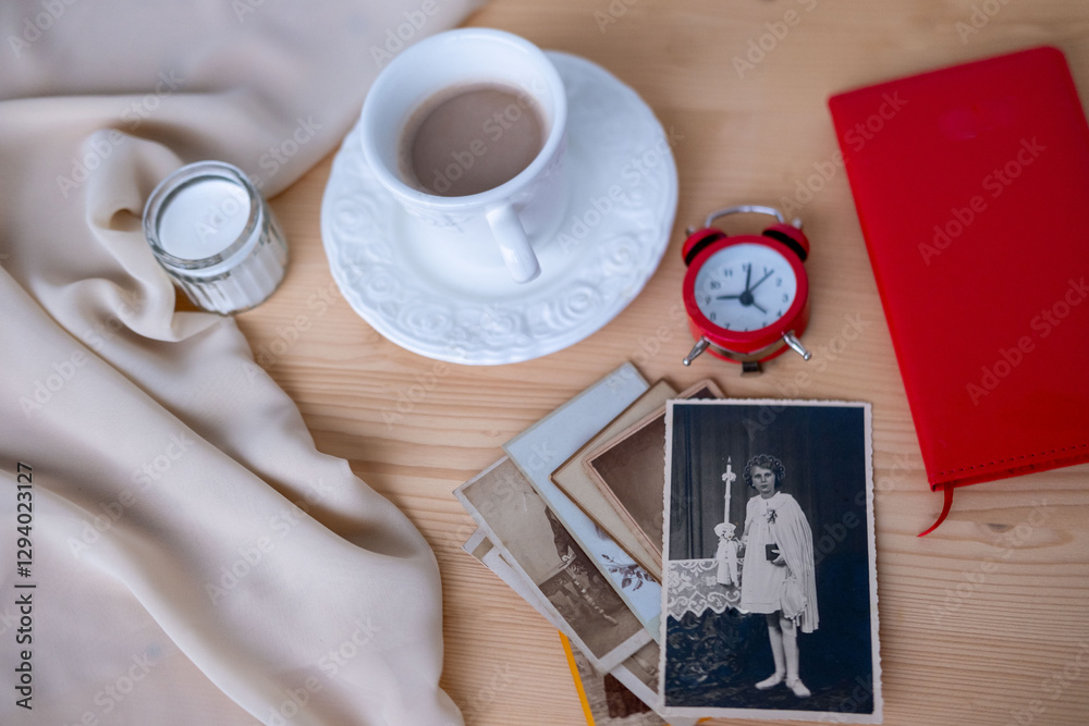 Cozy workspace with red notebook, coffee cup, alarm clock, and glasses, ready for productive day, time management flat lay,