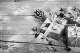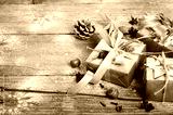 Rustic Christmas wreath with gifts on wooden background. Free space for your text.