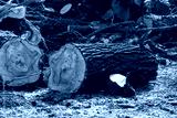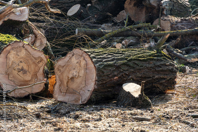 Stacked logs and scattered branches lay in a sunlit forest clearing, surrounded by fresh greenery, indicating recent forestry activity during spring