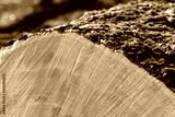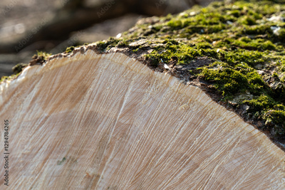 A tree stump sits in a forest, covered with vibrant green moss. The detailed wood texture reveals the natural patterns and layers of the tree.