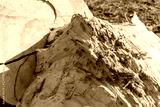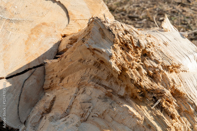 A freshly cut piece of wood reveals intricate patterns and textures, illuminated by sunlight in a rural outdoor environment during the day.