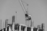 A large crane lifts materials on a construction site, showcasing the ongoing building process with a clear blue sky overhead