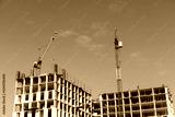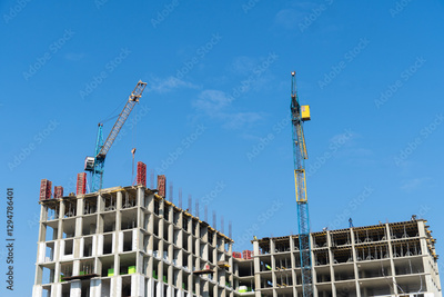 Cranes operate on a construction site where a new building is taking shape against a bright blue sky on a sunny day in an urban environment