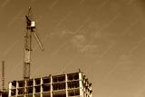 A construction site features workers on a building frame, with a large crane positioned above. The bright blue sky provides a clear backdrop
