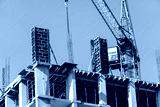 Construction workers erect concrete structures and use cranes to lift materials at a high-rise building site on a sunny afternoon.