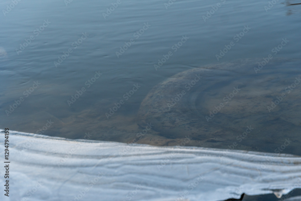 Dark patches appear on the surface of a lake, indicating pollution while a white cloth lies along the edge of the water, emphasizing environmental issues