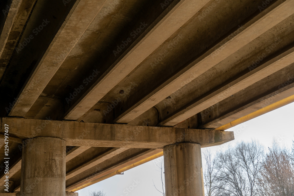 Capturing a detailed view from beneath a large concrete highway overpass, emphasizing the structural beams and pillars against a cloudy sky