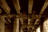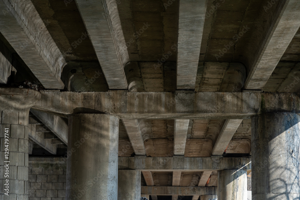 Sunlight filters through the gaps of an urban overpass, highlighting the concrete structure and cast shadows on the ground below