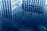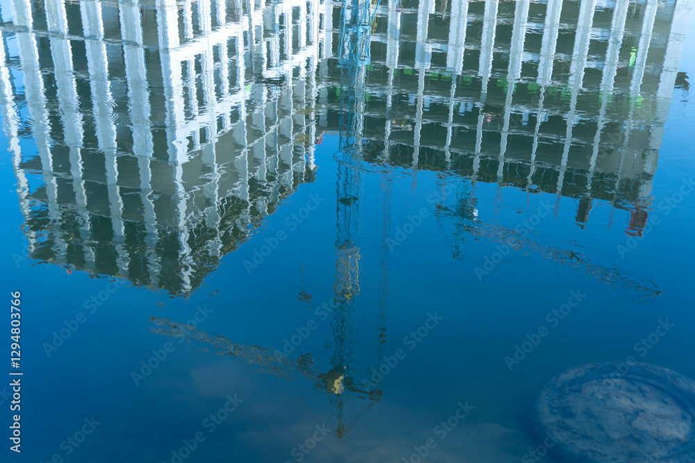 Bright reflections of buildings are seen in calm water, showcasing the juxtaposition between architecture and construction in an urban setting.