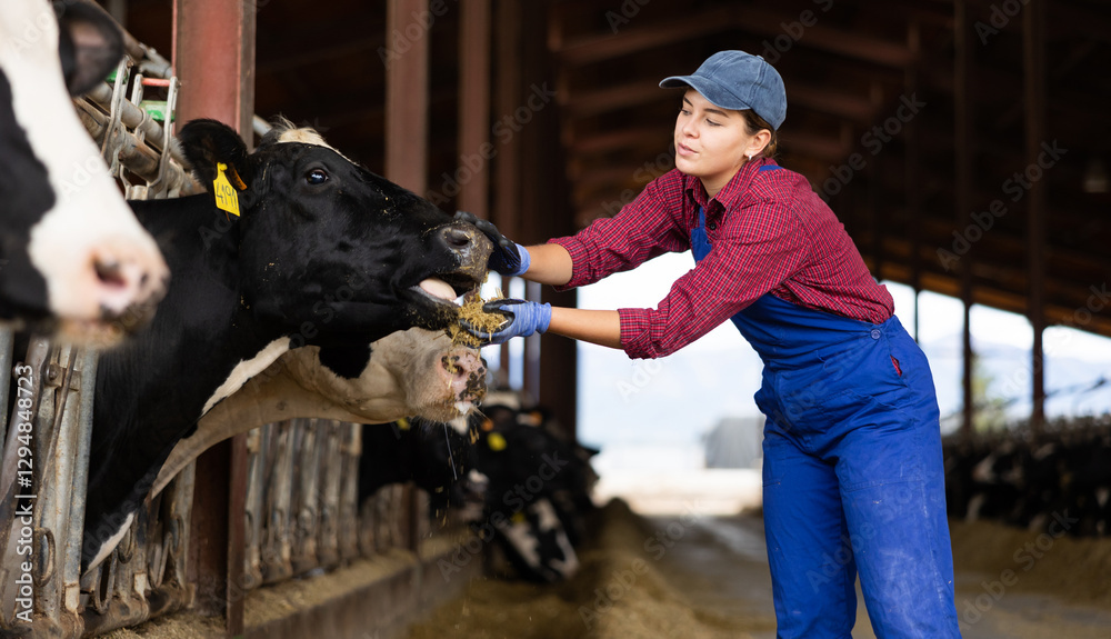Farmer woman feeds cows in cowshed at dairy cow farm