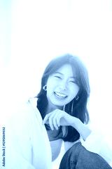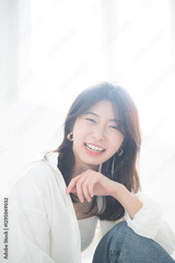 逆光の中イヤリングをしたお洒落な女性のクローズアップポートレートカメラ目線の大笑い