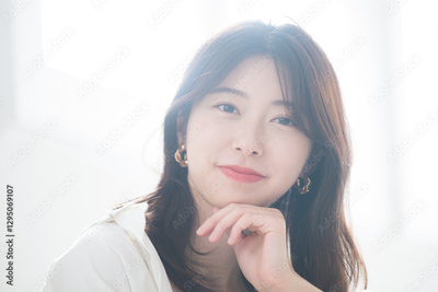 逆光の中イヤリングをしたお洒落な女性のクローズアップポートレートカメラ目線