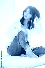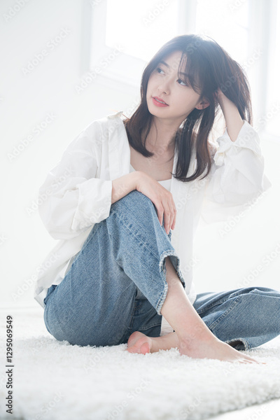 髪をかき上げる爽やかな女性 ヘアケアや美容やビューティーの全身 アンニュイな表情