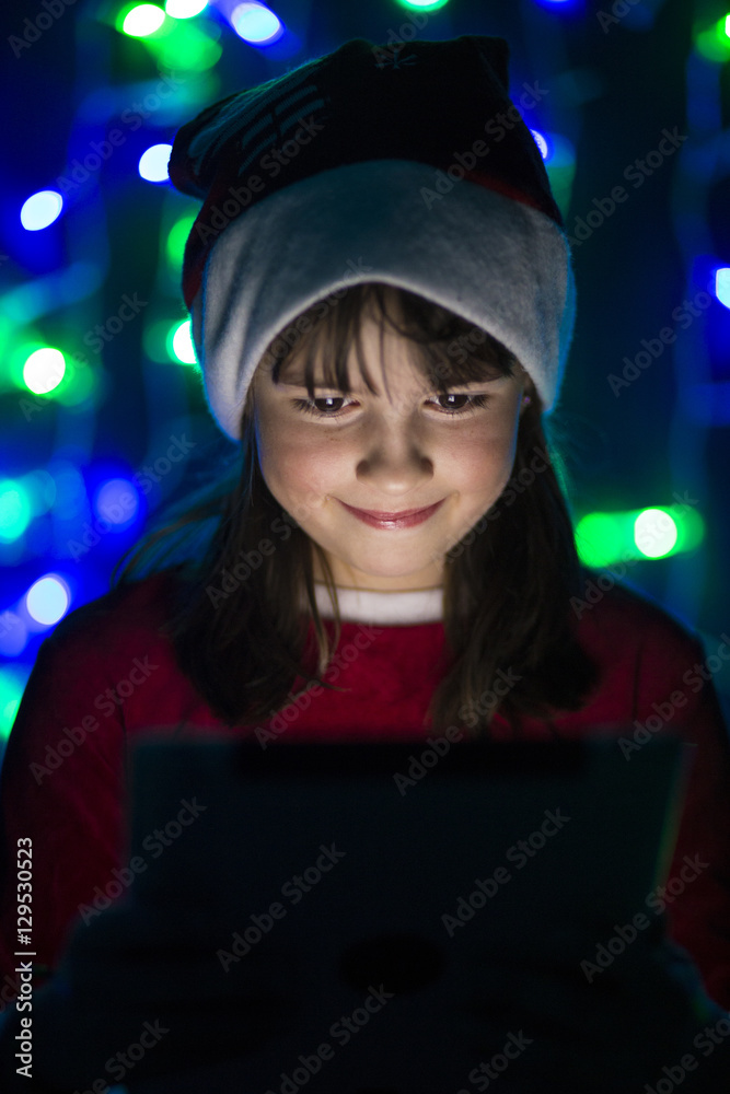 Young smiling girl in santa's hat holding tablet pc before bokeh lights background in dark room