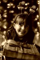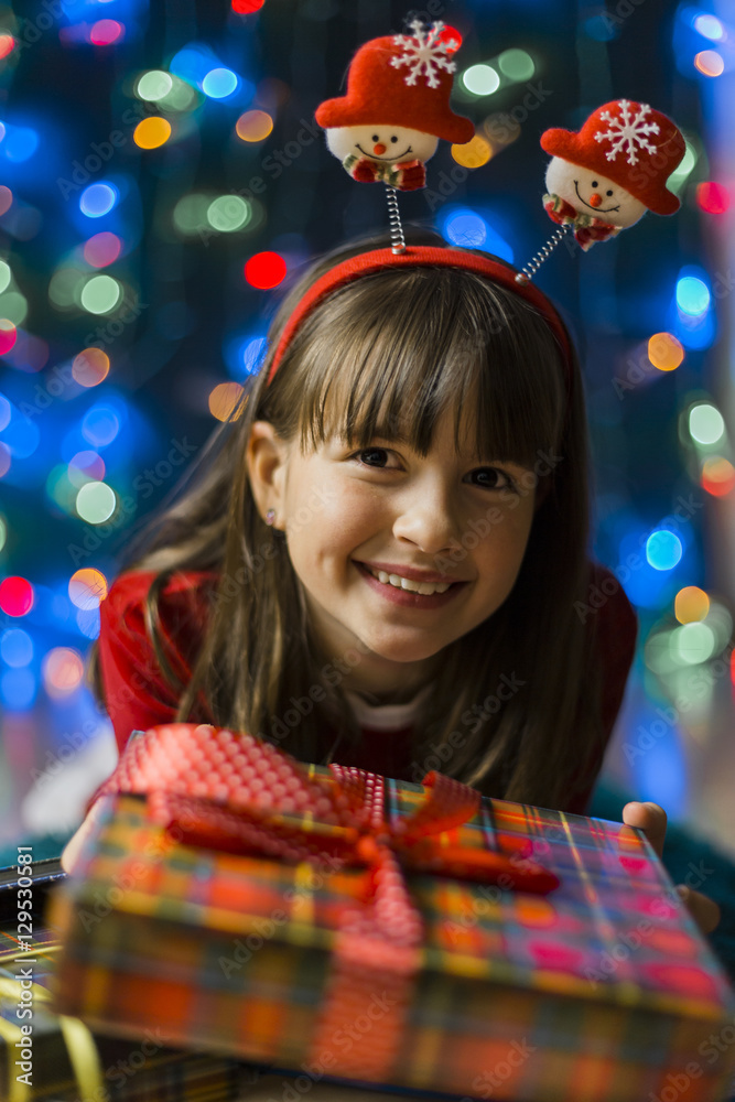 Young smiling girl wearing red dress near gift box