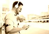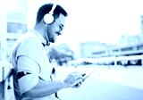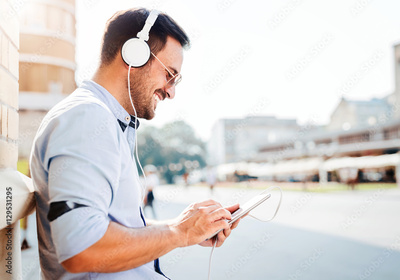 Portrait of handsome young smiling man with tablet. Listening to