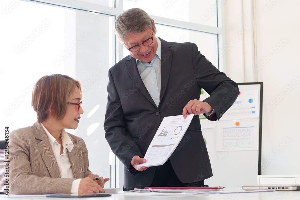 Senior business professionals discussing a financial report, reviewing investment opportunities, and planning company growth strategies.