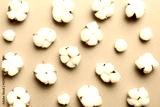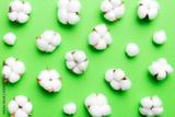 Autumn Floral Flat lay background composition. Dried white fluffy cotton flower branchwith green leaf top view on colored table with copy space