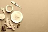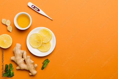 Natural cold and flu home remedies and thermometer. Natural ingredients for immunity stimulation and viruses protection. top view flat lay