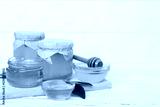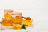 Honey in jar with leaves and honey dipper on colored background top view with copy text