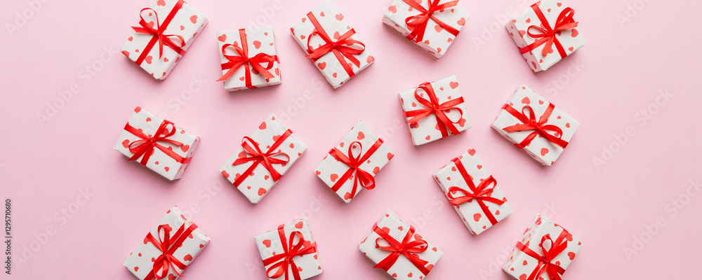 Valentine day composition Background: red gift box with bow and heart. Christmas present. View from above. Holday greeting card