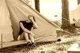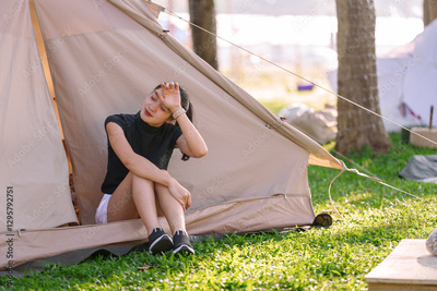 Young woman sitting at the entrance of her tent, feeling the heat during a summer camping trip, touching her forehead while experiencing discomfort from the warm sunshine