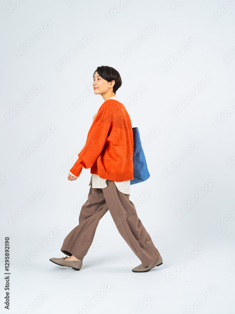 女性、歩く、ウォーキング、外出、歩行者、日本人、全身、スタート、目標、お出かけ、ショッピング、観光、旅行、観光客、買い物、主婦、ママ、カジュアル、ファッション、おしゃれ、笑顔、ポジティブ、元気、運動、トートバッグ、キャンペーン、セール、通勤、学生、通学、カラフル、アパレル、前進、進歩、挑戦、チャレンジ、横顔、横向き、側面、散歩、将来、写真、広告、切り抜き、白バック、コピースペース、建築パース、添景