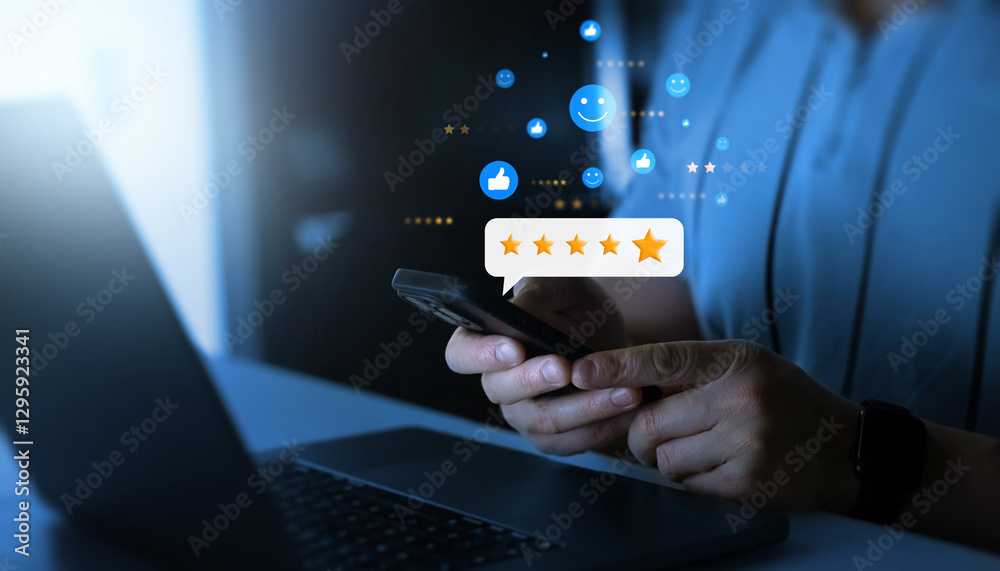 Person gives leave feedback on the bought product with five star rating. Review customer satisfaction feedback. Satisfaction, quality and performance.