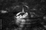 Rustic basket of boletus mushrooms on a forest meadow covered in green lush grass. Wild mushroom hunting in summer