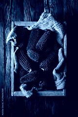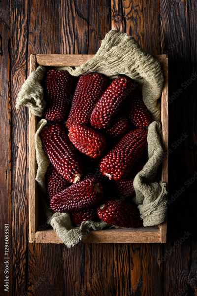 Red dried popcorn corn cobs in wooden box on rustic table. Food photography
