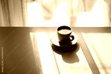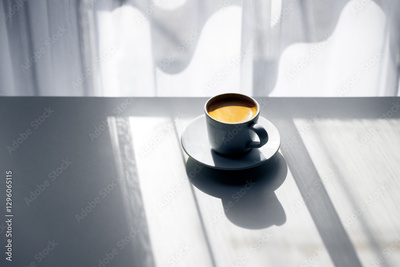 Morning espresso coffee by the window with natural light. Minimalist food and drink shot