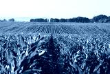 Lush green corn rows stretching across rolling farmland. Agricultural field scenery