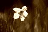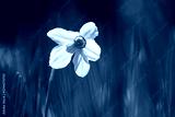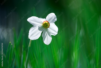 Flower of white Narcissus on green grass background in spring garden close up