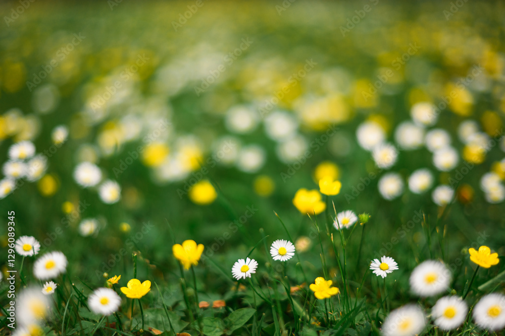 A forest meadow covered with vibrant white and yellow spring flowers. Close-up of natural beauty