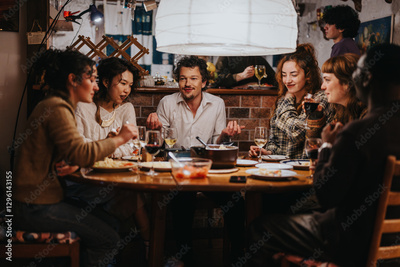 A group of people gather around a table enjoying food and beverages, creating a warm and lively atmosphere indoors. The setting conveys companionship, laughter, and a sense of welcoming coziness.