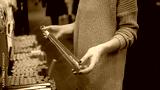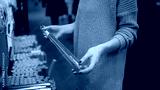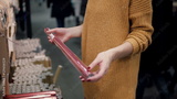 Young woman in orange sweater chooses wrapping paper Christmas decor.