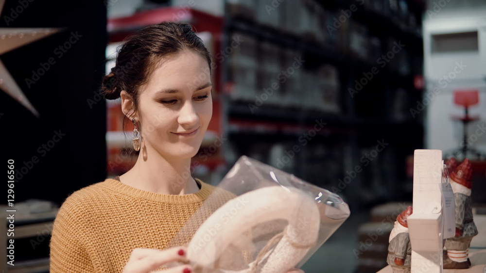 Attractive happy young woman chooses at store Christmas wreath. decor for home interior