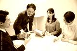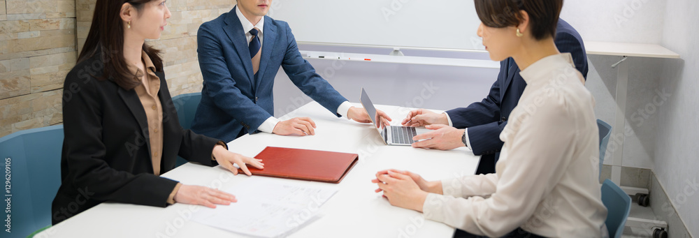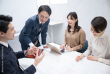 使いやすい複数の男女のビジネスマンのミーティングの様子 広角