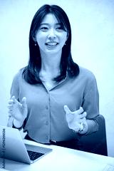 会議室で企画や資料の説明をジェスチャーでする若いかわいいオフィスカジュアルの女性