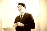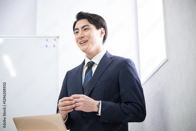 プレゼンテーションをするスーツを着たハンサムな30代の男性ビジネスマン ホワイトボードの前に立つ