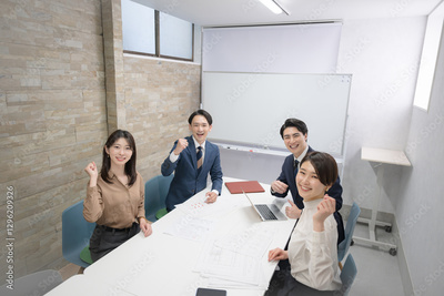 Multiple male and female businessmen in a meeting Looking at the camera, gut-punching, wide angle