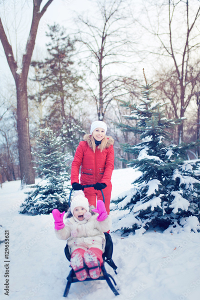 Happy mother and baby playing outdoors in winter