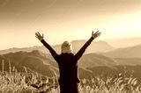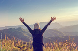 Carefree Happy Woman Enjoying Nature on grass meadow on top of mountain cliff with sunrise. Beauty Girl Outdoor. Freedom concept.