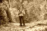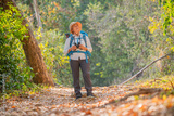 Senior woman is hiking outdoors, enjoying nature expression looks into the distance observing and possibly guide trekking and trail ecotourism adventure concept.