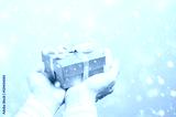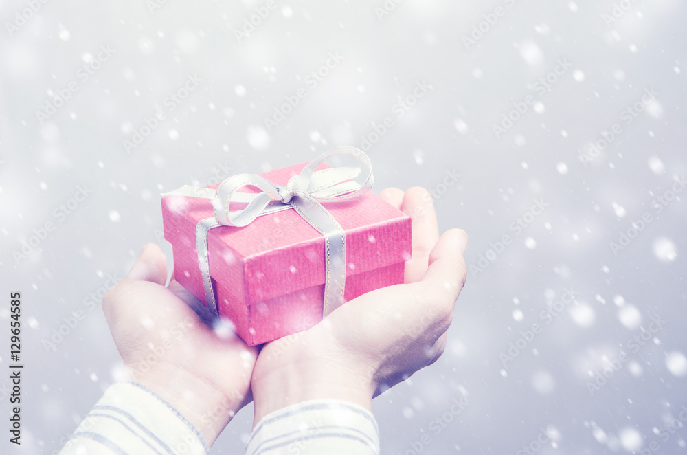 Closeup, Hand holding red gift box and snow in winter, New year holidays and greeting season concept