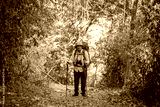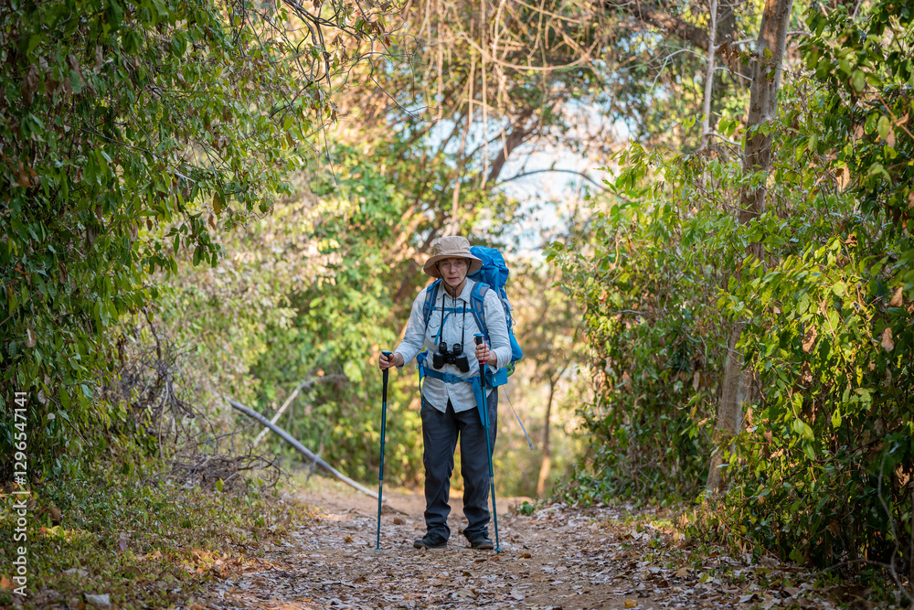 Senior woman is hiking outdoors, enjoying nature expression looks into the distance observing and possibly guide trekking and trail ecotourism adventure concept.