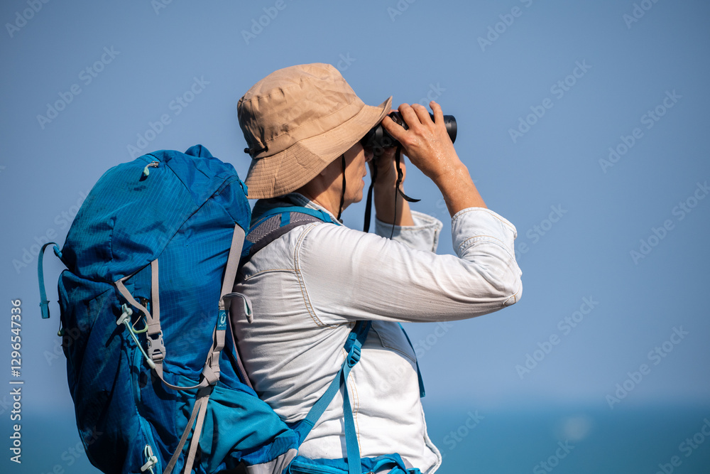 Senior woman is hiking outdoors, enjoying nature expression looks into the distance observing and possibly guide trekking and trail ecotourism adventure concept.