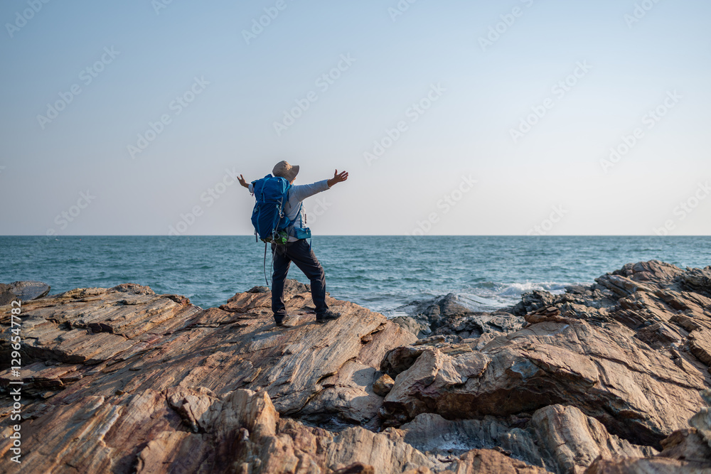 Senior woman is hiking outdoors, enjoying nature expression looks into the distance observing and possibly guide trekking and trail ecotourism adventure concept.